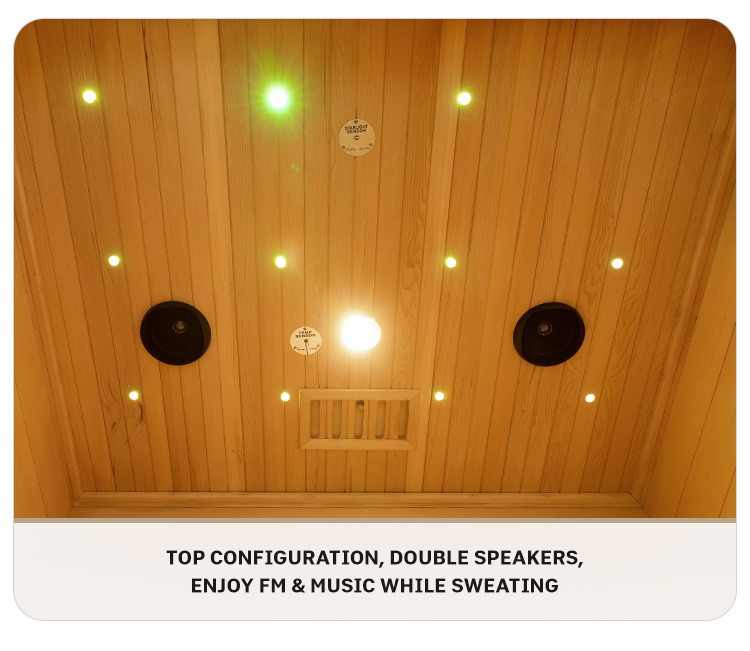 Systema dual-oratoris in summo configuratur, adiuvans FM radiophonicum et musicam lusoriam. Potes frui melodiis vel programmatibus radiophonicis, dum sudor, upgrading experientiam immersivam sauna.