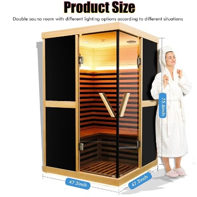 Premium Hemlock Construction: Crafted from high-quality hemlock, this V-shaped far infrared sauna room boasts durability and a natural aesthetic, providing a luxurious retreat for relaxation and wellness.Spacious Design: With dimensions of 1200x1200x1920mm, this double-person sauna offers ample space for two individuals to enjoy a comfortable and rejuvenating sauna experience.Stylish and Functional Features: Burana duplici speculo fores cum lignea dimidium-per V informibus tractat et nigrum concava exornantur partes, haec sauna combines elegantia cum functionality. Lux teak color pingere addit tactum ruditatis ad altiore designs.advanced calefactio technology instructa X calefactio laminis et X epoxy laminis, haec sauna ensures efficient et uniformis calor distribution. The temperature can be set between 20-60°C, with individual control for the foot sole, allowing for personalized comfortEnhanced Entertainment and Convenience: Enjoy your favorite music with the built-in Bluetooth music player and top-mounted speakers. In III-meter-diu potestatem funis, disposito secundum American signa, ensures facile setup et usum, providente commodum pro users.