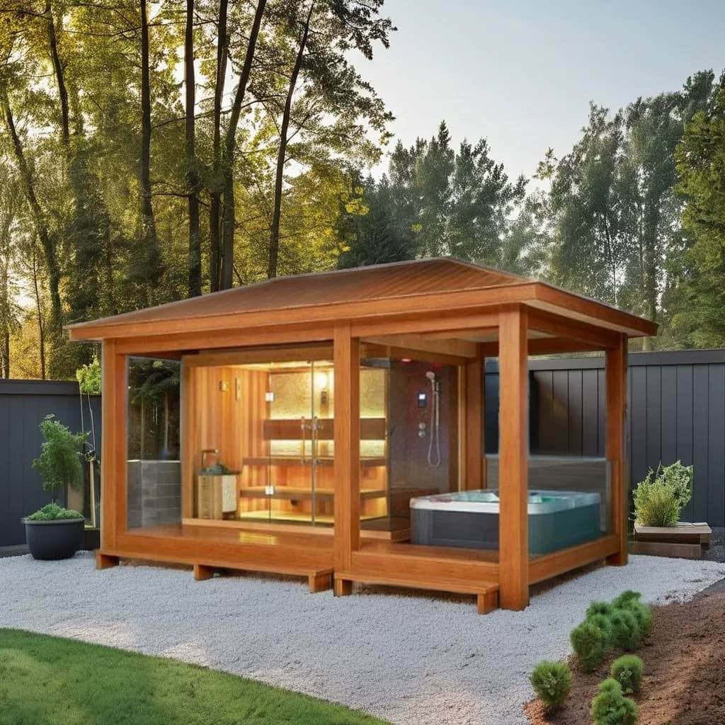 Hoc Foris Integratum est Sauna Jacuzzi Combo - Lignum Solidum Temperatum Cortis vitreis/Villae est facilitas integralis otium destinata solum ad spatia velit sicut villae et villae. Conclave cum sauna coniungit et jacuzzum intra compages ligni solidi, vitreis clausuris paribus perlucentibus. Cum textura naturalem retinet, compagem ambitus (viridis, superficies stratae) occultas miscet, privatum spatium familiarum relaxationem creat. Sequens imaginum series ostendet suum integratum consilium, res materiales, effectus institutionem, usum missionum multiplicium angulorum, intuitive commoda uber exhibens.